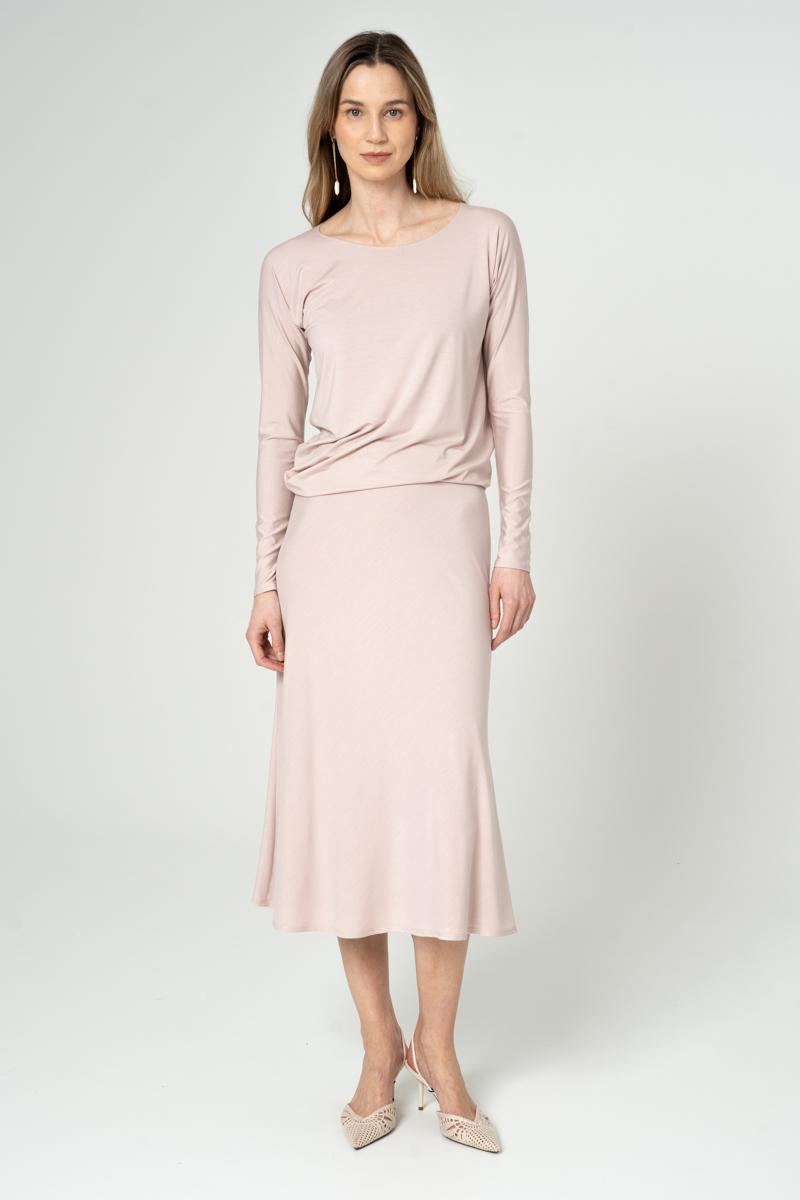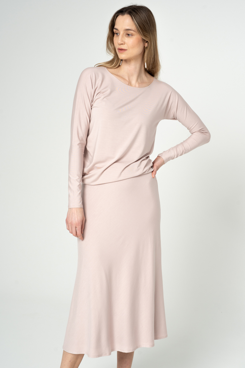 Bluzka z drapowanym bokiem i wąskim rękawem. Uszyta z modalowej dzianiny, która jest naturalna i wyjątkowa odporna na uszkodzenia. Nie mechaci się, nie zmienia swojej formy i daje duży komfort noszenia. Fason – luźny i wygodny ukrywający niedoskonałości sylwetki.