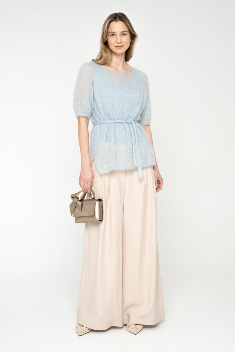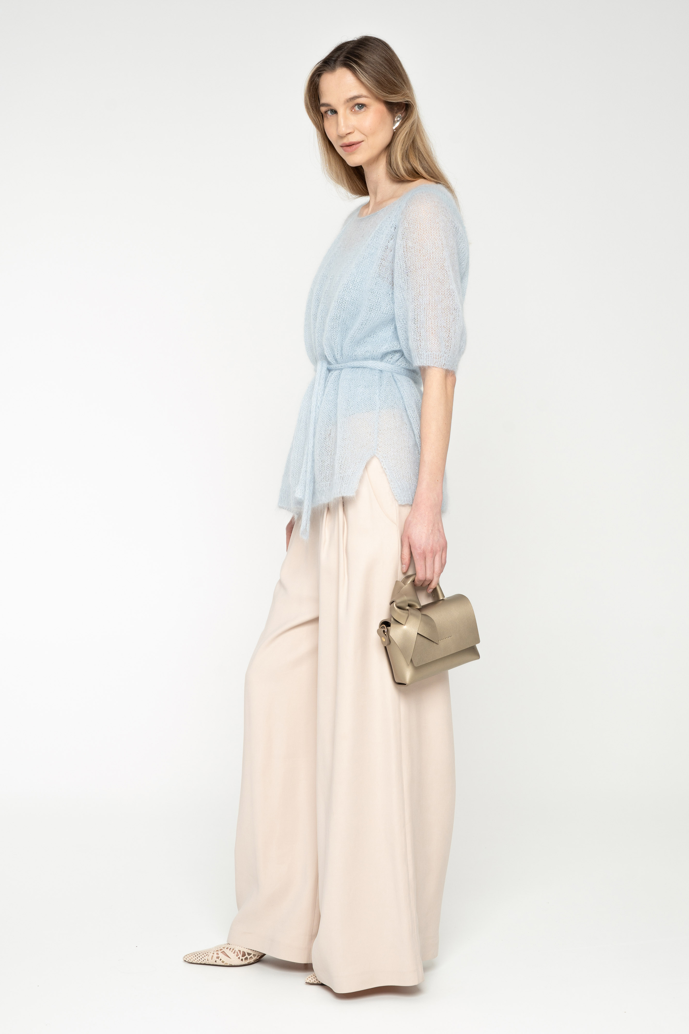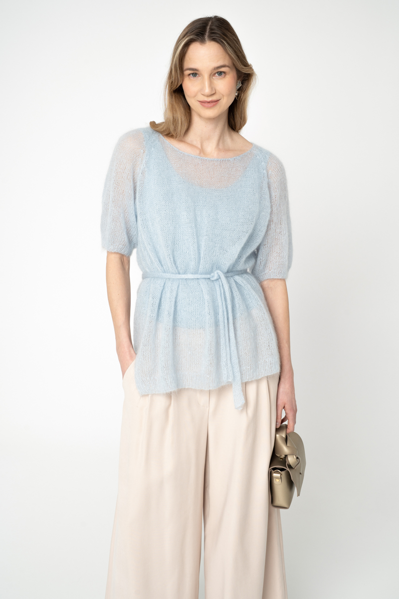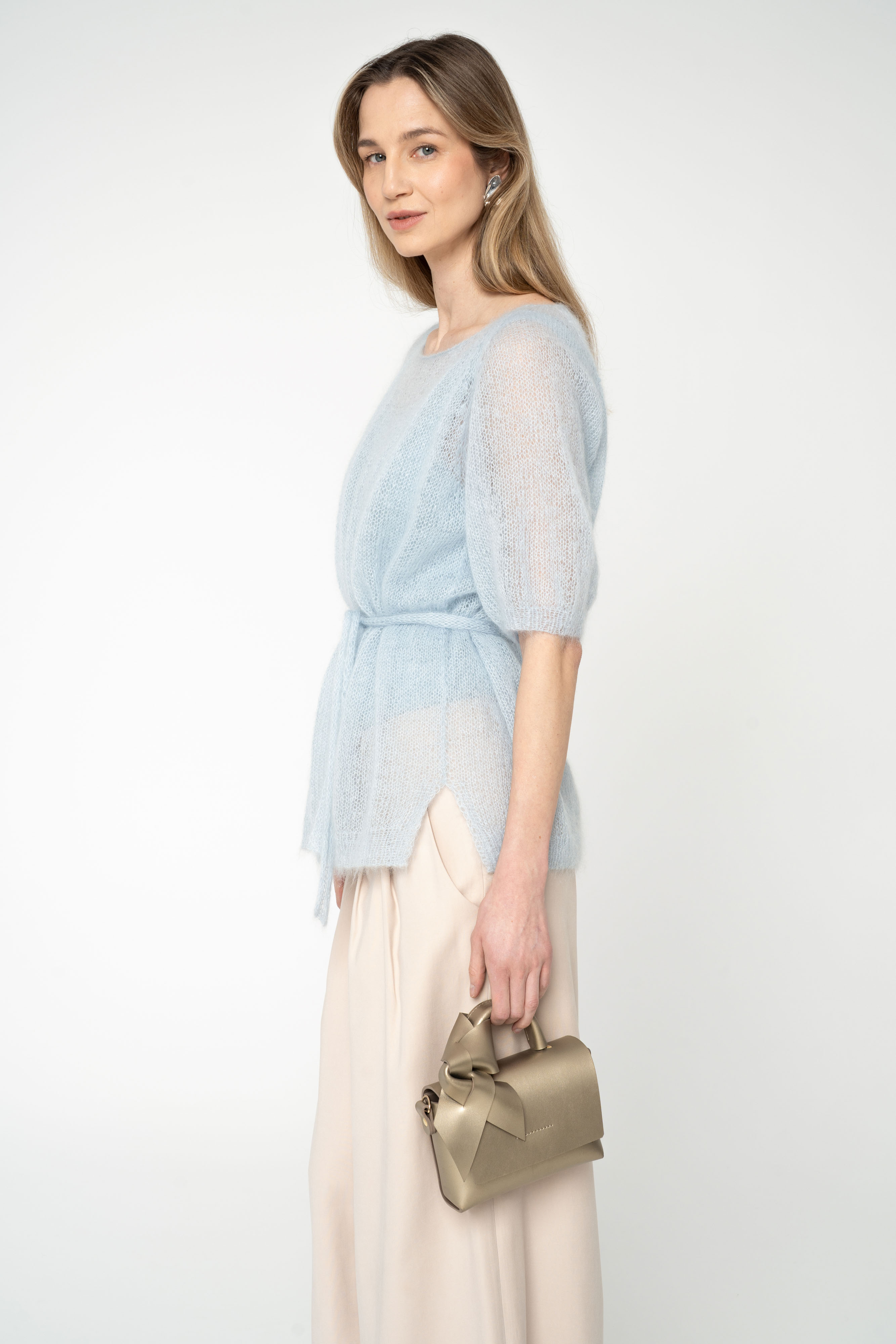 Ręcznie robiony sweter mgiełka z wyjątkowo miękkiej i przyjemnej włóczki. 100% naturalna włóczka z jedwabiu i kid moheru. Nie gryzie, nie pilinguje się. Jest bardzo wytrzymały.
