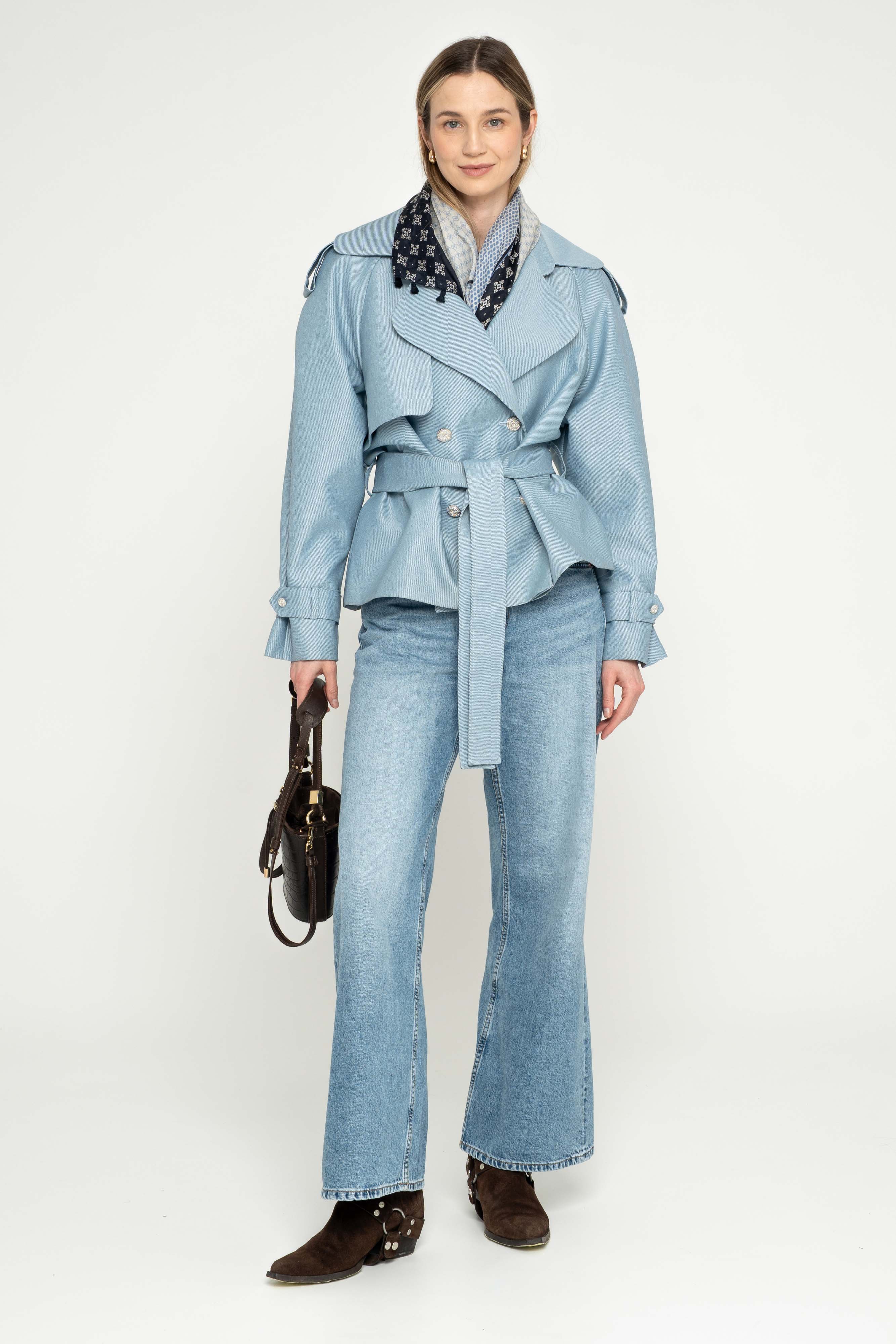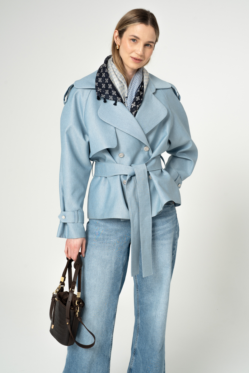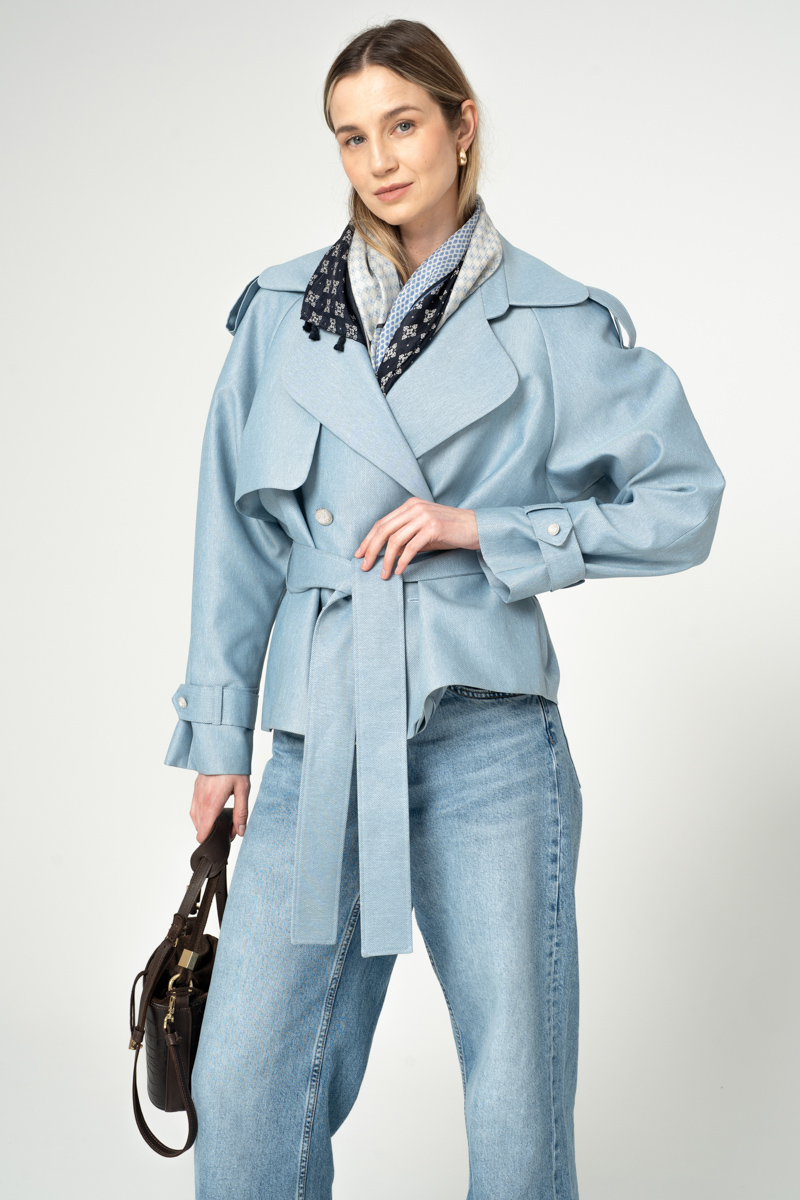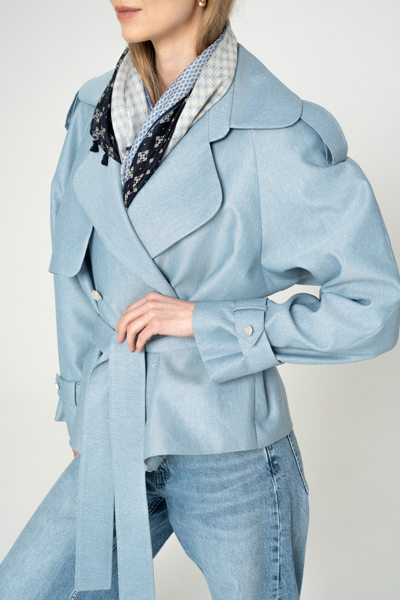 Nowoczesna kurtka trencz na bazie konstrukcji z lat 90-tych. Wykonany z bardzo wytrzymałej tkaniny w kolorze błekitnym. Wykończony srebrnymi metalowymi guzikami. Ortalion w prążek o matowym wykończeniu i wiskozowa podszewka. Zapięcie dwurzędowe, dodatkowo wiązanie paskiem.