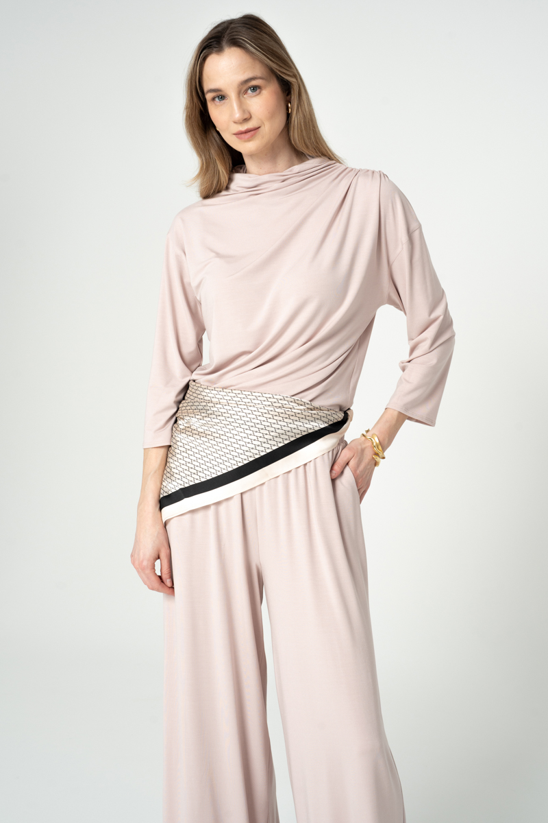 Marszczona bluzka z półgolfem. Rękaw w długości 3/4. Drapowanie po boku i na ramionach.