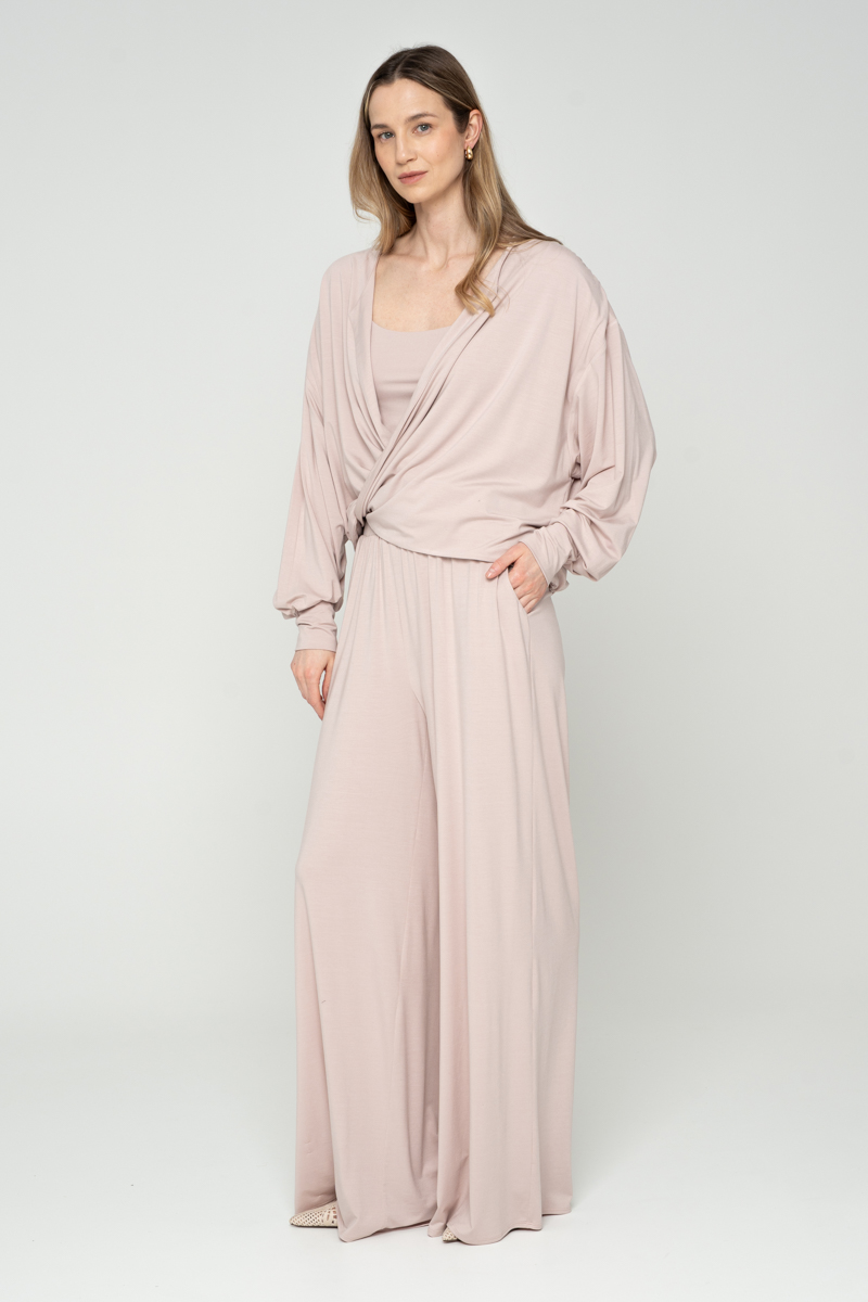 Bluza z kopertowym założeniem. Uszyta z dwóch warstw modalowej dzianiny. Rękawy szerokie wykończone mankietami. Na bokach guziki do zapięcia koperty.