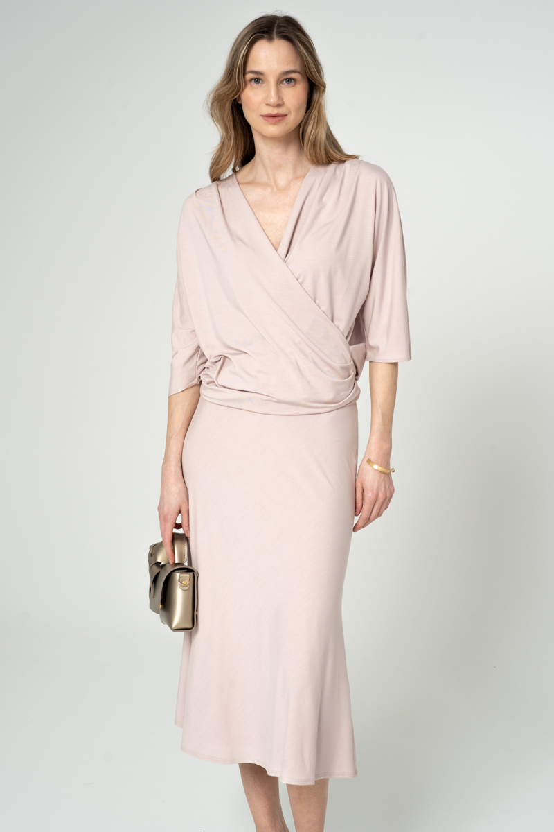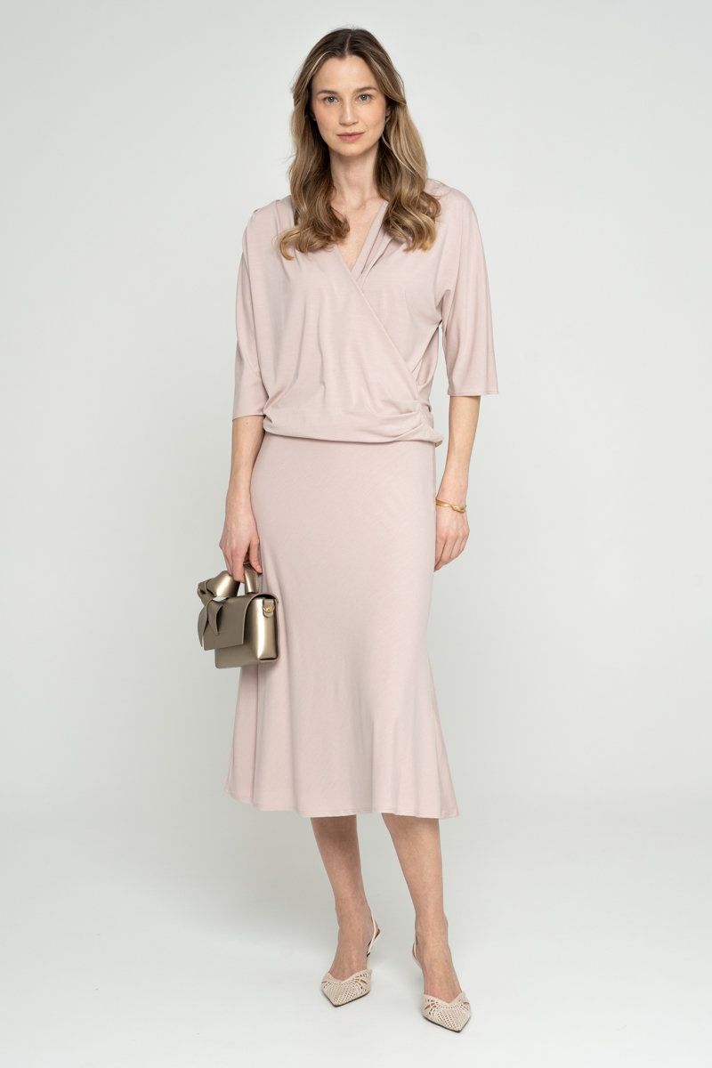 Spódnica szyta po skosie z dzianiny modalowej. Jest dwuwarstwowa przez co dzianina jest bardziej mięsista, kryjąca.