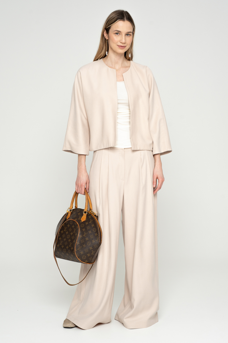Klasyczne szerokie spodnie z poszerzaną nogawką. Przy pasie zakładki, które wyszczuplają i dodają luzu. Nogawka bardzo szeroka, przez co spodnie się nie opinają i są bardzo wygodne. Fason bardzo uniwersalny, dobrze leży na różnych typach sylwetki. Materiał z delikatnym połyskiem.