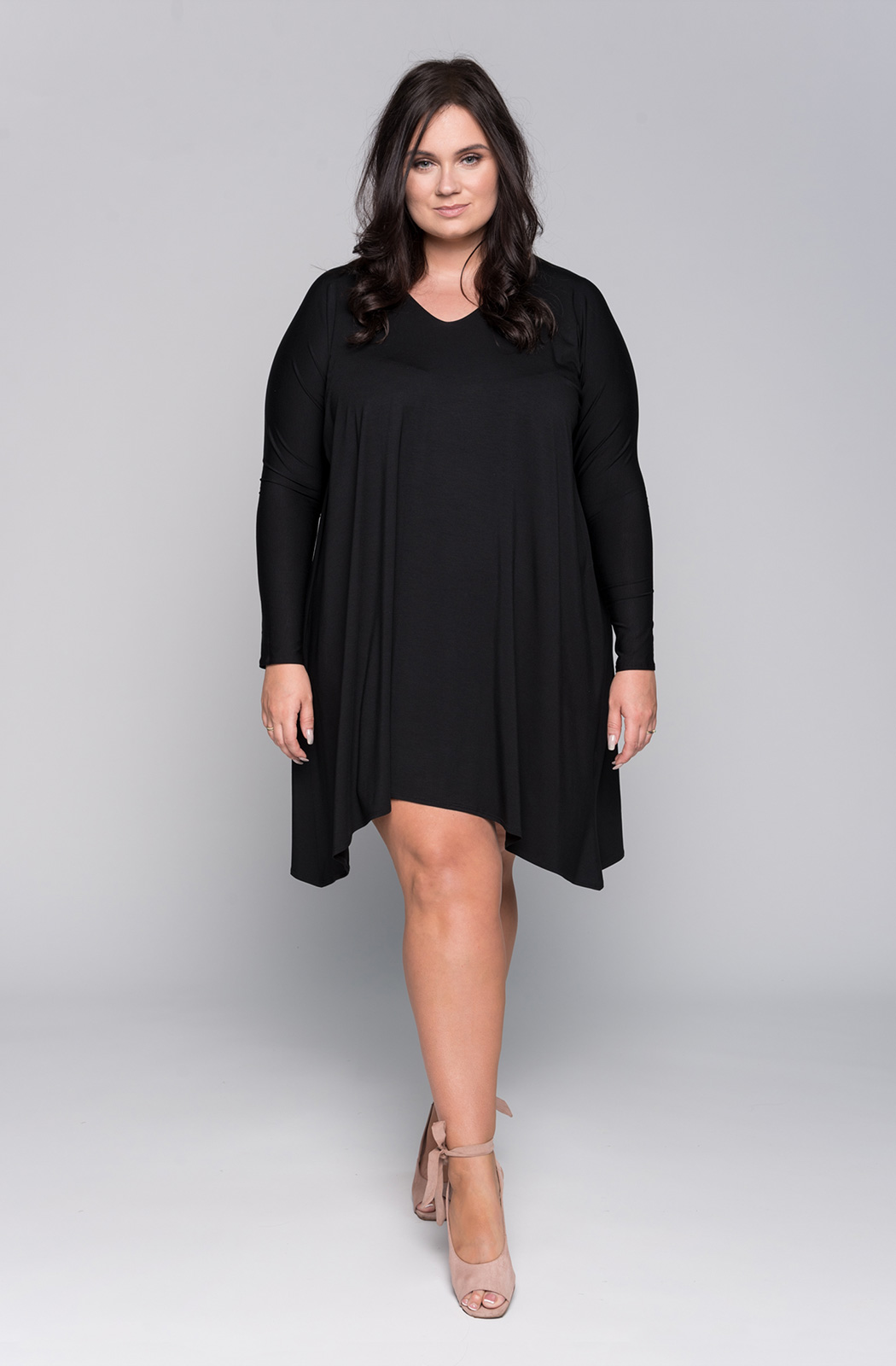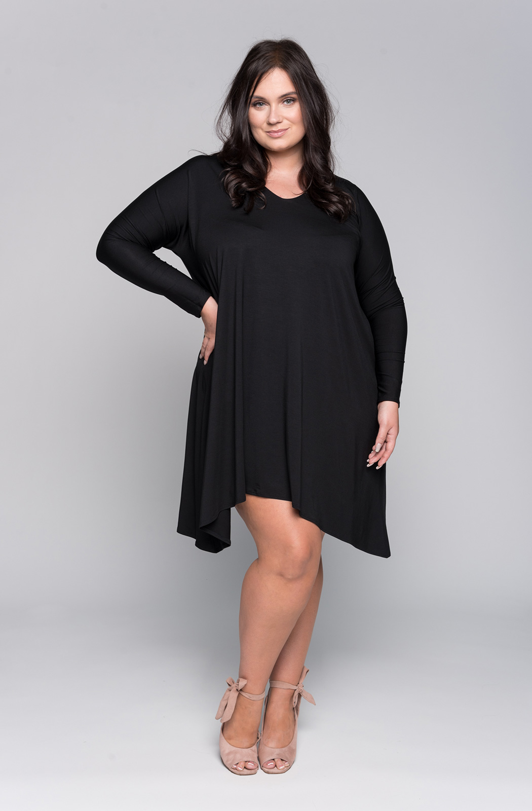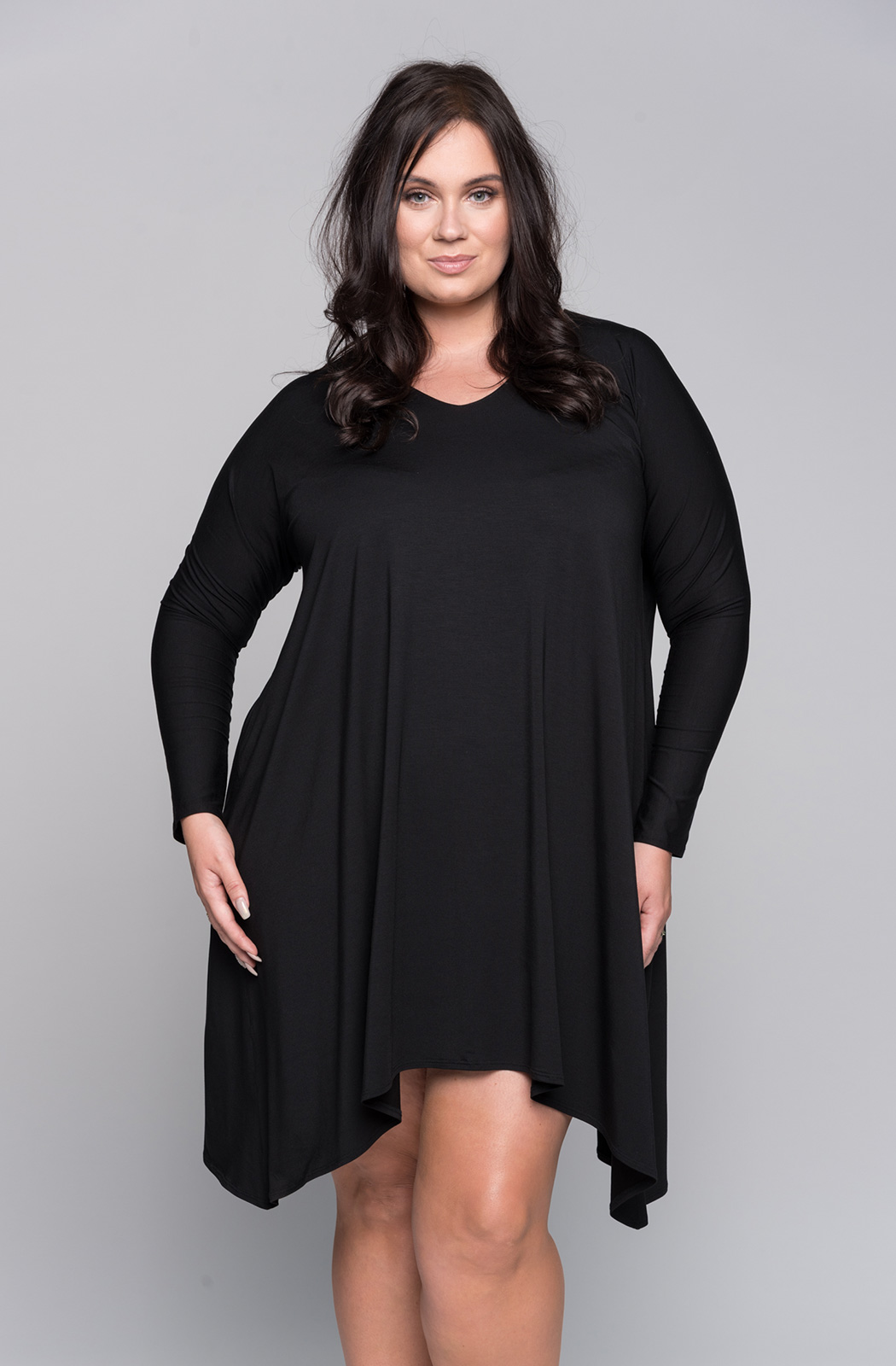 Sukienka z długimi przylegającymi rękawami i wydłużonymi bokami, które optycznie wyszczuplają całą sylwetkę.
