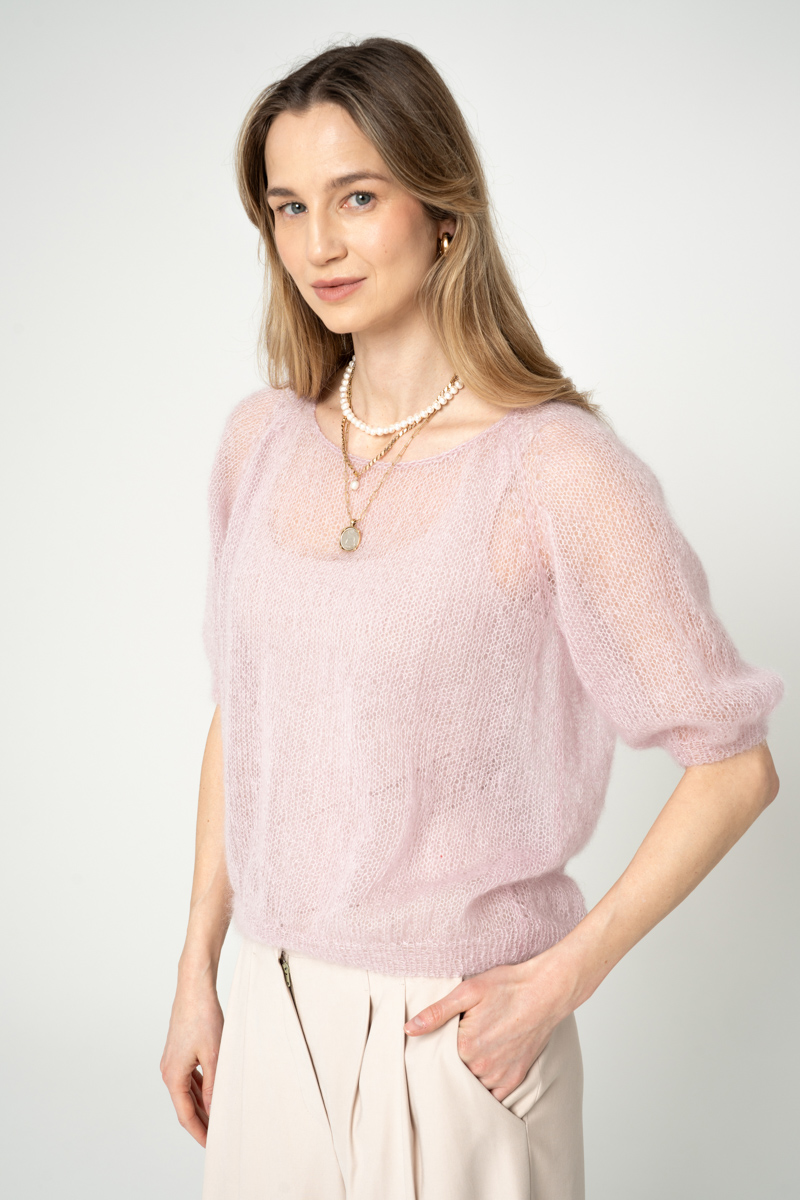 Ręcznie robiony sweter mgiełka z wyjątkowo miękkiej i przyjemnej włóczki. Krótki pudełkowy fason z reglanowym krótkim rękawem i dekoltem w łódkę. 100% naturalna włóczka z jedwabiu i kid moheru. Nie gryzie, nie pilinguje się. Jest bardzo wytrzymały. Sprzedawany w komplecie z topem no.2.