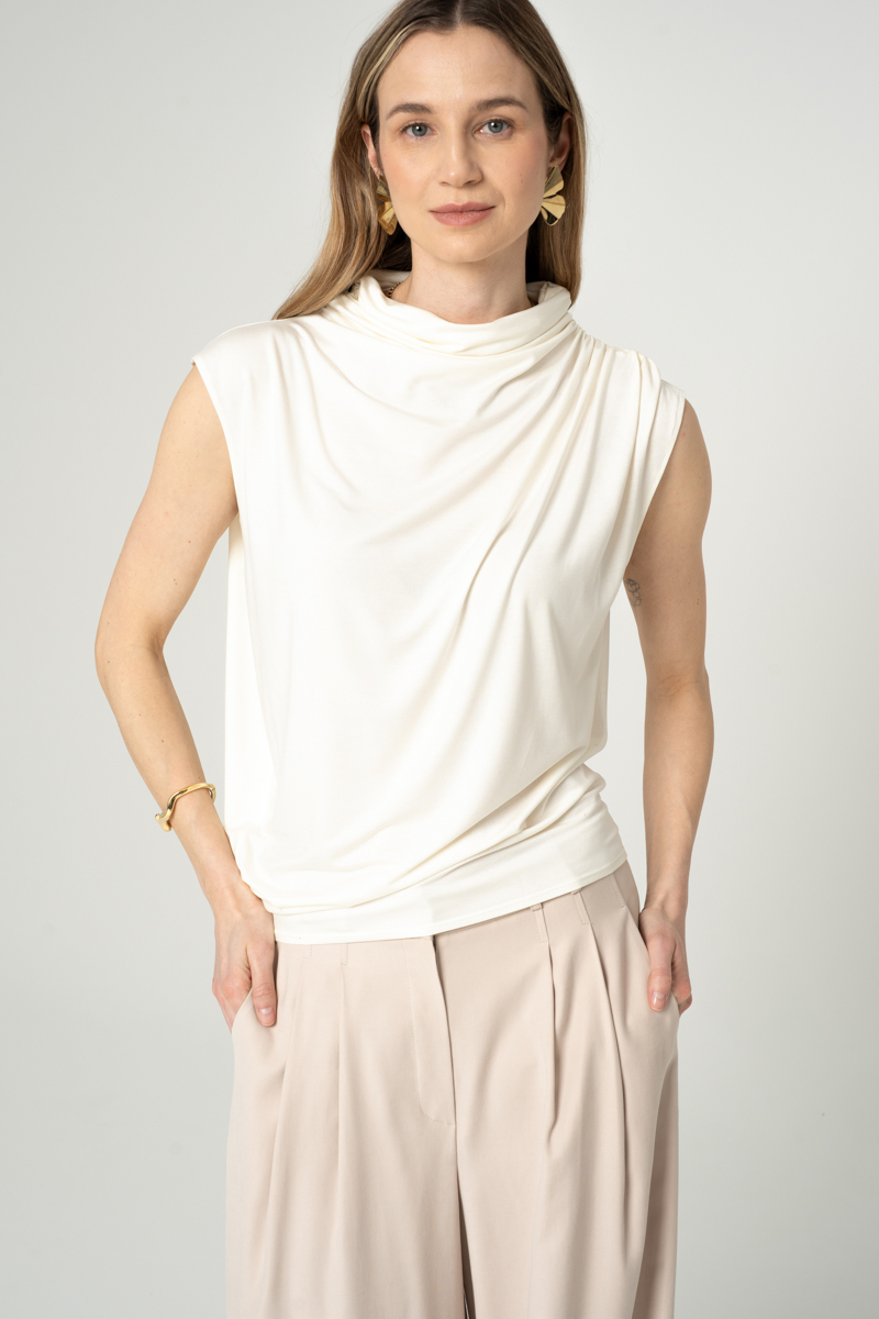 Top No.2/9 to luźna forma z szerokimi ramiączkami. Woda z przodu i na ramionach. Drapowanie po boku ukrywa niedoskonałości sylwetki. Uszyty z przyjemnej w dotyku modalowej dzianiny.