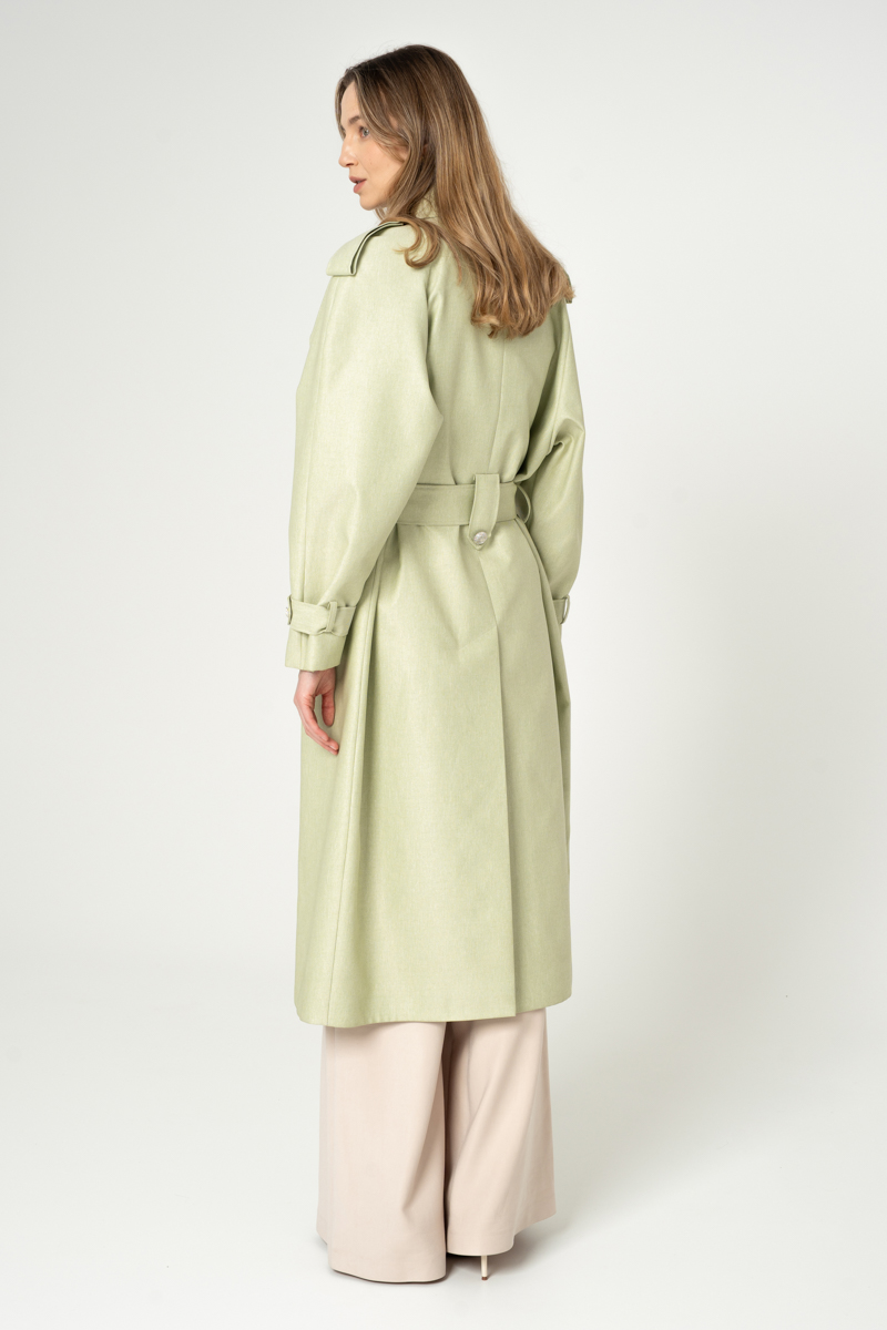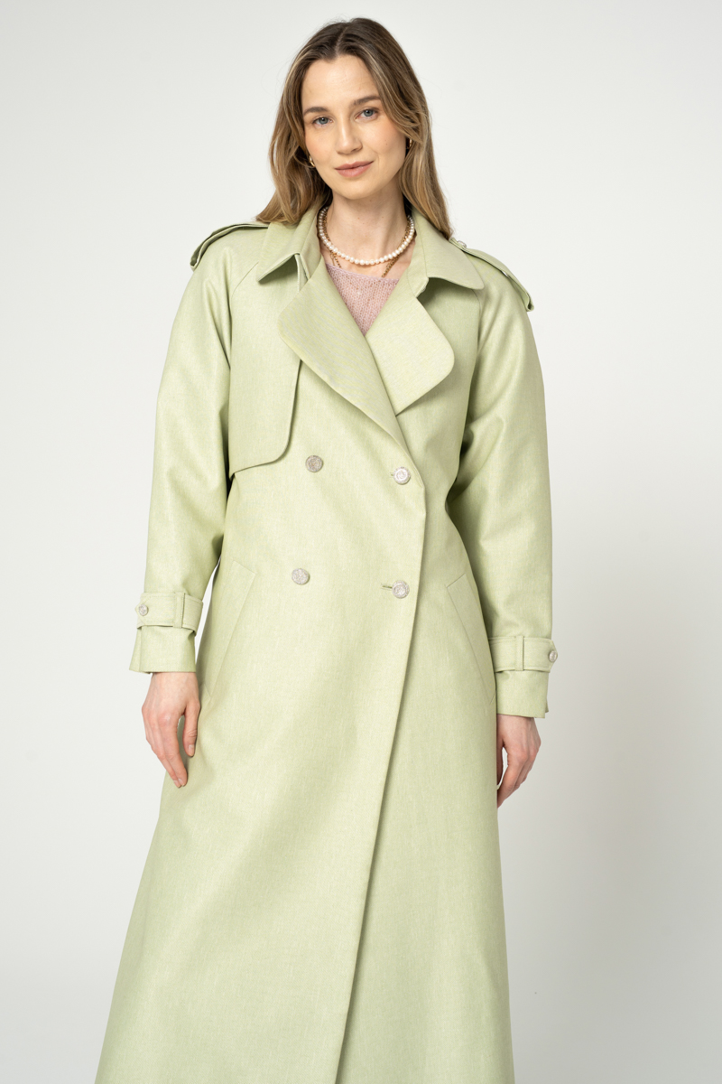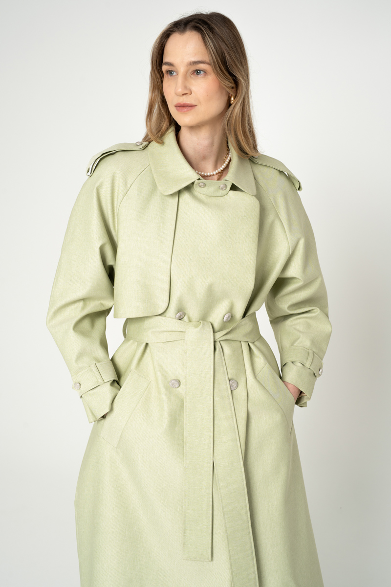 Nowoczesny trencz na bazie konstrukcji z lat 90-tych. Wykonany z bardzo wytrzymałej tkaniny w kolorze szałwiowym. Wykończony srebrnymi metalowymi guzikami. Ortalion w prążek o matowym wykończeniu i wiskozowa podszewka. Płaszcz dwurzędowy, przewiązany paskiem.